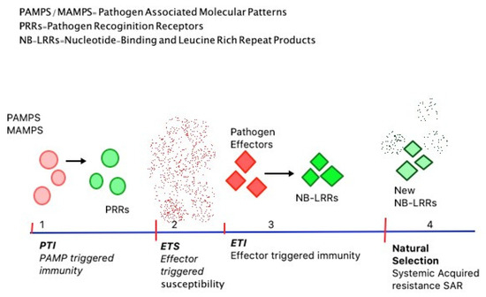 There are four phases of the plant’s immune system with respect to infection stages (Figure 1). In phase 1, PRRs recognize PAMPs which restricts further colonization by the pathogen, resulting in PAMP Triggered Immunity (PTI) [19]. PTI stops the free movement of the pathogen within the host and activates defence responses irrespective of the pathogen and is a form of non-host specific resistance [15]. Later, in the second phase, pathogens produce effectors, which interact with the ongoing PTI and induce Effector-Triggered Susceptibility (ETS) [19]. ETS is specific and involves the gene-for-gene hypothesis; according to which pathogen’s virulent gene interacts with the host’s susceptibility genes causing further disease [15]. In the third phase, NB-LRR proteins particularly recognize an effector from the pathogen, causing a chain of reactions termed Effector-Triggered Immunity (ETI). ETI responses can be interpreted as an acceleration of PTI. This often results in programmed cell death around the infection site followed by disease resistance [19]. Similar to ETS, ETI is also gene-specific with plants synthesizing particular cytoplasmic R (resistance) proteins which directly interact with pathogen’s avirulent or Avr proteins [15]. The fourth phase is essentially driven by natural selection, as pathogens shed the ETI and prevent the induction of new effectors. ETI is triggered again when plants generate new NB-LRRs or gain alternative NB-LRR alleles through horizontal gene flow. This latter form of immunity acquired is described as Systemic Acquired Resistance or SAR [15,19].