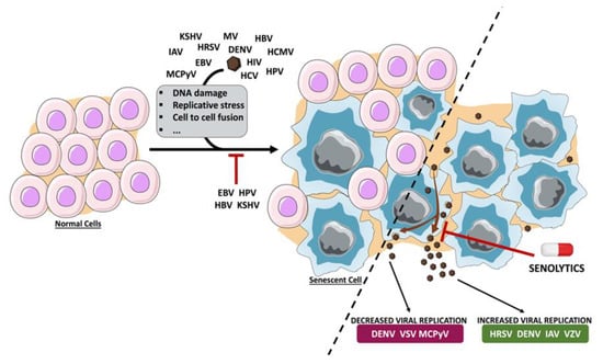 Schematic representation of the induction and/or inhibition of senescence by viruses and the effect of senescence on virus replication. Upon virus infection, cells can enter into senescence as a consequence of DNA damage, replicative stress or cell-to-cell fusion, among others. Cellular senescence limits the replication of different viral agents, whereas it contributes to the efficient replication of others. Consequently, targeting the senescent cells using senolytic agents has a negative or positive effect on virus infection, depending on the virus. Dengue virus (DENV), Epstein–Barr virus (EBV), hepatitis B virus (HBV), human cytomegalovirus (HCMV), human immunodeficiency virus (HIV), human papillomavirus (HPV), human respiratory syncytial virus (HRSV), influenza A virus (IAV), Kaposi’s sarcoma-associated herpesvirus (KSHV), Merkel cell polyomavirus (MCPyV), measles virus (MV), varicella-zoster virus (VZV), vesicular stomatitis virus (VSV).