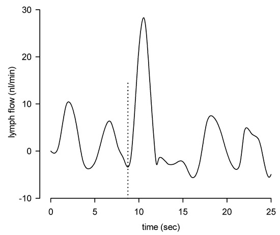 Modulation of lymphatic function: difference in oscillatory lymph flow induced by intrinsic contractions and one extrinsic contraction (experimentally induced at the time point indicated by the vertical dotted line).