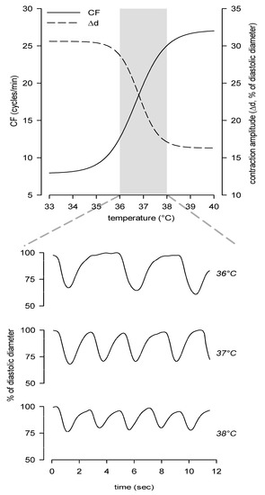 Temperature-dependent modulation of diaphragmatic lymphatics contractility, affecting both CF and contraction amplitude (Δd). Upper panel: positive chronotropic effect on CF (solid line) and negative inotropic effect on Δd (dashed line). Gray area highlights the range of steepest variation of both parameters. Lower panel shows representative traces of vessel diameter over time recorded in the range of 36–38 °C. Data taken from [94].