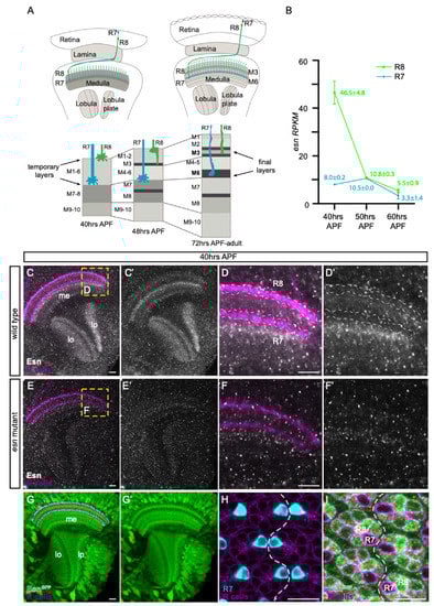 In previously generated developmental transcriptomes of the R8 and R7 photoreceptors [], we observed that esn was enriched in R8 compared to R7 cells at 40 h after pupal formation (APF) (Figure 1B). This is some hours before R8 cells proceed to their final target layer, which will be called M3 in the adult [,]. We first used anti-Esn antibody to analyze expression in R8 and R7 photoreceptor growth cones in the medulla of 40 h APF animals since these structures sense the environment and Fmi is expressed in them [,,]. We observed an Esn layered pattern in the medulla and lobula, as well as signal in the lobula plate (Figure 1C,C’). However, we could not detect any signal difference between R8 and R7 growth cones (Figure 1D,D’), suggesting that Esn protein levels in the R8 were probably below the antibody detection limit. It actually looked like there was a dip in the signal where R8 and R7 growth cones were, while there was a faint signal in between the R8 and R7 growth cones, and stronger signal below R7 growth cones (Figure 1D’). These patterns were strongly reduced in the mutant background (for details on the mutant see next section) (Figure 1E–F’). We analyzed Esn expression at later stages, between 48 and 70 h APF, when the R8 extends a filopodia to its final target layer and transitions into a synaptic terminal (Figure S1A–C’). Due to the expression of Esn in neurites between the R8 and the R7 final target layers we could not discern expression in the R8 growth cone/axon from expression in other neurons.