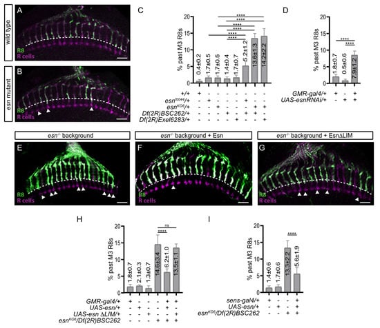 -2G: w; esnKO6/Df(2R)BSC262; GMR-gal4 UAS-Dcr2 Rh6-LacZ/UAS-esnΔLIM