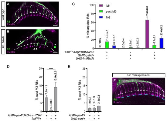 Given that fmi regulates R8 layer selection [,], and that fmi and esn interplay has been shown essential in other neurons [], we wondered if fmi and esn also cooperated in R8 final layer selection. In mosaic animals it has been reported that a big percentage of the single fmi mutant R8 axons stop at the M1 temporary layer []. Alternatively, in esn mutant animals most R8 axons extending past the M3 layer terminate in between the R8 and R7 layers (Figure 2B,C). In order to reconcile these two different phenotypes, we used the GMR-gal4 driver to knock down fmi and performed a detailed phenotype analysis of R8 axons (Figure 3A–C). We observed that, similar to mosaic experiments [], 65.6% ± 6.0 SD of R8 axons terminated in their temporary layer at the edge of the medulla. Interestingly, we also observed that 6.1% ± 3.4 SD of R8 axons overshot the M3 layer terminating between the R8 and R7 and that 23.6% ± 5.2 SD were almost at the M6 layer. Indeed, in parallel analysis of the mutant showed that besides the R8 axons terminating between the M3 and M6 layers (15.3% ± 2.1 SD), there were 6.2% ± 2.5 SD R8 axons that almost reached the M6 layer (Figure 3C). A possible redundancy with the paralog gene pk, which genetically interacts with fmi in the context of planar cell polarity [,], could explain why few R8 axons almost reach M6 in esn mutants, while many more do so in fmi mutants. It is of note that in our analysis of pk mutant alleles we also observed R8 axons overshooting past the M3 layer (Figure S2). In summary, both fmi and esn mutations show R8 axons failing to stabilize in the M3 layer and extending past it, or almost reaching the M6 layer.