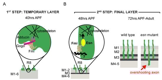 A model for R8 layer selection. (A) Molecular machinery present in the first step of R8 layer selection when growth cones reach their temporary layer. Gogo and Fmi interact in cis. The cytoplasmic domain of Gogo mediates signaling that modulates the cytoskeleton and Fmi function [,,]. (B) Model proposed for the second step of R8 layer selection when R8 growth cones extend to their final target layer and transform into synaptic terminals. We propose that Fmi could signal through Esn to modulate the cytoskeleton and mediate stabilization in the final target layer. Most probably other cell surface molecules, acting in cis with Fmi and/or in parallel, are involved in this process.