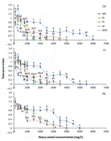 Tolerance index of fungi strains under various heavy metal concentrations. Columns denote the mean values and bars indicates standard error. Different letters show statistically significant different values (p < 0.05) from each other as calculated by Tukey’s honestly significant difference test. Means with same letters within the isolate groups are not significantly different at Honestly Significant Difference (HSD(0.05)) Aspergillus sclerotiorum (A1), Aspergillus aculeatus (E1), Aspergillus niger (G03), Komagataella phaffi (WS), and Trichoderma harzianum (Y1).