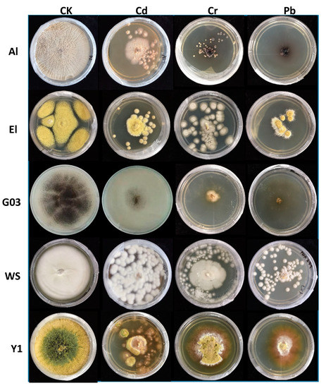 Growth of fungi on media supplemented with 1500 ppm concentration of Cd, Cr, and Pb. Five isolates including Aspergillus sclerotiorum (A1), Aspergillus aculeatus (E1), Aspergillus niger (G03), Komagataella phaffi (WS), and Trichoderma harzianum (Y1) were grown on control media (CK), cadmium supplements media (Cd), chromium supplemented media (Cr), and lead supplemented media (Pb). The growth of Aspergillus sclerotiorum (A1) and Aspergillus niger (G03) was observed to be severely retarded in Pb amended media.