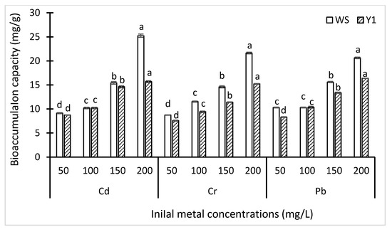 Variable bioaccumulation capacities of two strains (WS and Y1) were observed under different metal concentrations (Figure 4). Generally, the bioaccumulation capacity of WS was better than Y1. These two isolates showed better capacity with the increasing concentration of each metal. The highest bioaccumulation capacity was demonstrated by WS at 200 ppm of Cd (25.23 mg/g). Similarly, the capacity of WS was slightly higher for Cu (21.63 mg/g) than Pb (20.63 mg/g) at 200 ppm. On the contrary, Y1 demonstrated the highest bioaccumulation capacity at 200 ppm of Pb (16.37 mg/g).