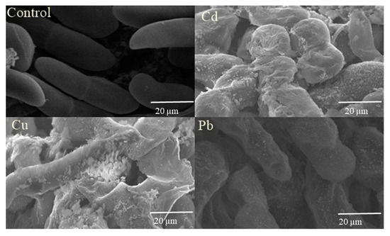 Scanning electron micrographs revealed the deposition of Cd, Cr, and Pb on the cell surface of K. phaffi. Due to the accumulation of metals, the mycelia of K. phaffi was observed to be irregular in shape. Our findings are similar to the findings of [43] who observed the similar morphological changes under metal exposure.