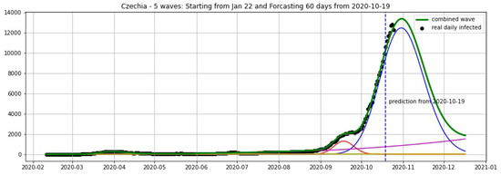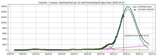 Czechia: fitting and forecasting (green curve) from 25 October with 5 wavelets. The green curve is the combination of other curves which are EF wavelets.
