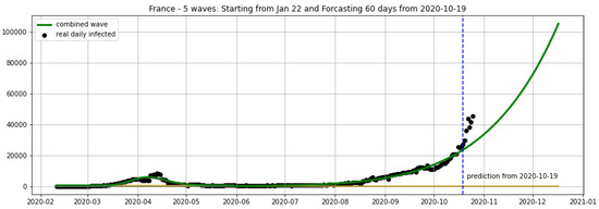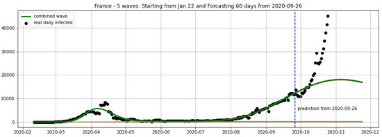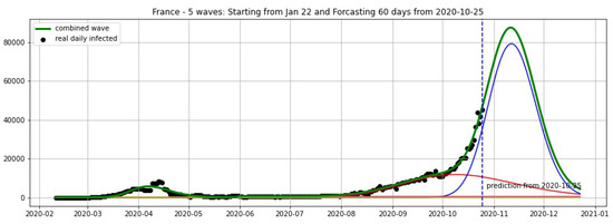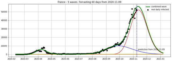 France: fitting and forecasting from 9 November with 5 wavelets. The green curve is the combination of other curves which are EF wavelets.