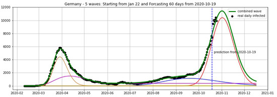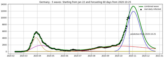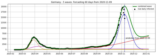 Germany: fitting and forecasting from 9 November with 5 wavelets. The green curve is the combination of other curves which are EF wavelets.
