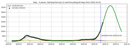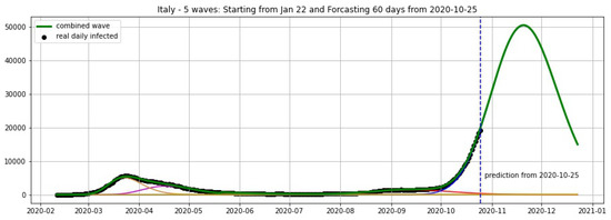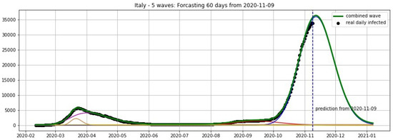 Italy: fitting and forecasting from 9 November with 5 wavelets. The green curve is the combination of other curves which are EF wavelets.