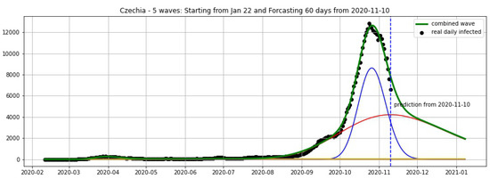 Czechia: fitting and forecasting from 10 November with 5 wavelets. The green curve is the combination of other curves which are EF wavelets.