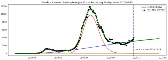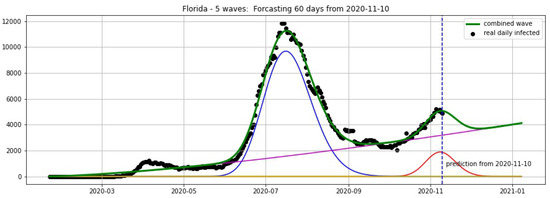 Florida: fitting and forecasting from 10 November 2020. The green curve is the combination of other curves which are EF wavelets.