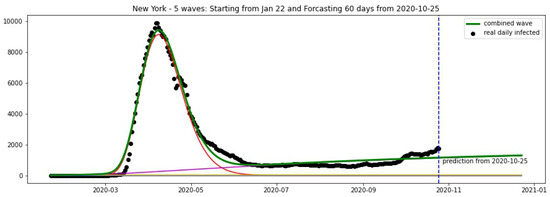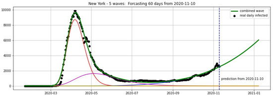 New York: fitting and forecasting from 10 November 2020. The green curve is the combination of other curves which are EF wavelets.