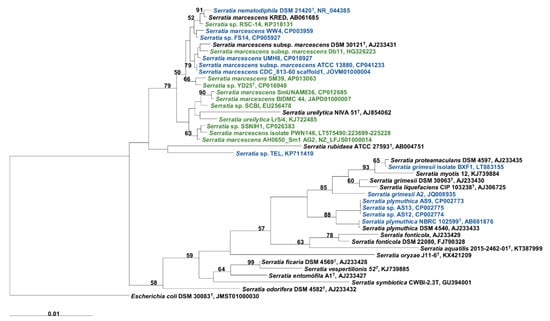 Eighty-four Serratia genomes available on NCBI, representing all the publicly available genomes, were included in this study (Table S1), obtained from 49 different hosts and isolated from 29 countries [13,17,18,19,20,21,22,23,24,25,26,27,28,29,30,31,32,33,34,35,36,37,38,39,40,41,42,43,44,45,46,47,48,49].