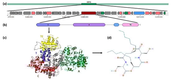 All serrawettin W1 biosynthetic gene clusters were identified as NRPS clusters. Moreover, the bioinformatic analysis predicted an architecture including the domains condensation (C), adenylation (A), thiolation (T), and thioesterase (TE) in all the serrawettin W1 biosynthetic genes (Figure 2).