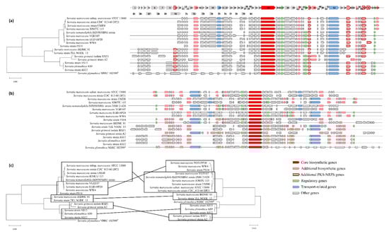 Serrawettin W1 gene cluster analysis. The phylogenetic relationship was established with Mega X software by the Neighbor-Joining method on aligned serrawettin W1 gene clusters of Serratia strains ATCC 13880, CDC_813-60 DP21, UMH8, IOMTU 115, DSM 21420, VGH107, EGD-HP20, WW4, FS14, BIDMC81, TEL NODE_13, NBRC 102599, BXF1, A2, AS13, AS9, and AS12. (a) Phylogenetic tree based on protein sequences of the serrawettin W1 biosynthetic gene cluster on an established genetic organization. (b) Serrawettin W1 biosynthetic gene clusters based on natural genetic organization. (c) Comparison of the phylogenetic tree based on protein sequences of the serrawettin W1 biosynthetic gene clusters (left) with the phylogenetic tree of the serrawettin W1 biosynthesis protein (right). The scale bar of 0.050 infers the nucleotide substitutions per 100 nucleotides.