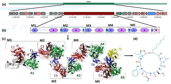 Serrawettin W2: from the biosynthetic gene cluster to the structure of serrawettin W2. Genetic organization of the genome of Serratia strain PWN146 by antiSMASH analysis, Phyre2 tridimensional prediction of the serrawettin W2 biosynthetic protein, and PubChem 2D structure of serrawettin W2. (a) Serrawettin W2 biosynthetic gene cluster with identification of the swrA core gene; (b) swrA gene organization: five modules (M1–M5) with C, condensation domain; A, adenylation domain; T, thiolation domain; and TE, thioesterase domain; (c) biosynthetic protein with five modules (M1–M5), each composed of condensation, adenylation, and thiolation domains, and in the last module an additional thioesterase domain.