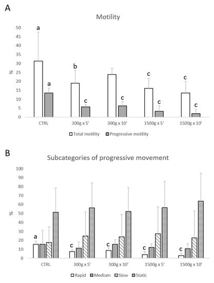 Effects of different centrifugation protocols on total and progressive motility of equine spermatozoa analyzed by Computer-Assisted Sperm Analysis (CASA). The reduction of the sperm motility was observed by analyzing total and progressive motility (panel A) and four subcategories of progressive movement: rapid, medium, slow, and static (panel B). One-way ANOVA followed by Tukey’s post hoc test: a,b = p < 0.05 a,c = p < 0.0001. Different superscripts indicate statistically significant differences.