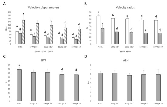 Similarly, sperm velocity subparameters (VAP, VSL, VCL) were significantly reduced at almost any tested centrifugation protocol (Figure 2A). In details, VAP was significantly reduced after centrifugation at 300× g for 5 min (p < 0.01), at 300× g for 10 min and 1500× g for 5 and 10 min (p < 0.0001) respectively vs. control; VSL was significantly reduced after centrifugation at 300× g for 5 min (p < 0.001), at 300× g for 10 min and 1500× g for 5 and 10 min (p < 0.0001) respectively vs. control; VCL was significantly reduced after centrifugation at 300× g for 10 min (p < 0.01) and at 1500× g for 5 and 10 min (p < 0.0001) respectively vs. control. Additionally, velocity ratios were significantly reduced at any tested centrifugation protocols (Figure 2B). In particular, STR was significantly reduced after centrifugation at 300× g for 5 min (p < 0.01), at 300× g for 10 min (p < 0.001) and at 1500× g for 5 and 10 min (p < 0.0001) respectively vs. control; LIN was significantly reduced at any tested centrifugation protocol (p < 0.0001 vs. control). However, BCF was significantly reduced at the strongest tested centrifugation protocols (p < 0.0001 vs. control; Figure 2C), while ALH was not altered (p > 0.05 vs. control; Figure 2D).