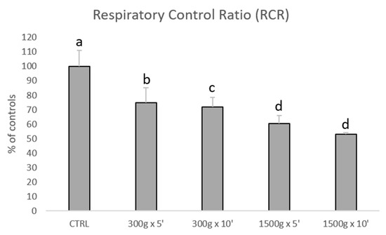 Subsequently, we investigated the effects of different centrifugation protocols on RCR values, which are an index of mitochondrial respiration efficiency. RCR values were significantly reduced showing a linearity by increasing force and time of the centrifugation protocol (Figure 3). In details, we calculated the following RCRs: 1.9 ± 0.2 for control group, 1.4 ± 0.2 for 300× g for 5 min (p < 0.05 vs. control), 1.4 ± 0.1min for 300× g for 10 min (p < 0.01 vs. control) 1.2 ± 0.1 and 1.2 ± 0.0 for 1500× g for 5 and 10 min respectively (p < 0.001 vs. control). No statistical difference was found between samples centrifuged at the same centrifugal force and different times (300× g for 5 min vs. 300× g for 10 min and 1500× g for 5 min and 1500× g for 10 min, p > 0.05).