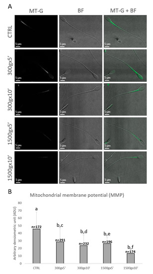 Representative photomicrographs of single equine sperm cells stained with MitoTracker Green FM (MT-G) after no centrifugation (CTRL) or centrifugation at 300× g for 5 min and 10 min and centrifugation at 1500× g for 5 min and 10 min. Corresponding confocal images showing MMP (column 1: MT-G), brightfield (column 2: BF) and merge (column 3: MT-G + BF) were reported. The average projection was obtained starting from a 0.5 μm-spaced z-stack acquired for an overall z-spanning of 2 μm. Scale bars were reported (panel A). Bar graph showing the effects of different centrifugation protocols on the Mitochondrial Membrane Potential (MMP) of equine spermatozoa. Data were shown as mean value ± standard deviation and expressed as Arbitrary Densitometric Units (ADU). Numbers of analyzed spermatozoa for each group are indicated at the top (panel B). One-way ANOVA followed by Tukey’s post hoc test: a,b = p < 0.0001; c,d = p < 0.0001; e,f = p < 0.0001.