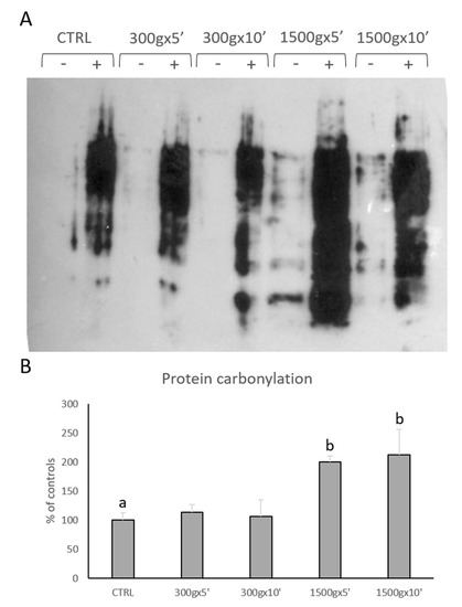 Representative OxyBlot without (-) and with (+) 2,4-dinitrophenylhydrazine (DNPH) derivatization of proteins extracted from equine sperm samples after no centrifugation (CTRL) or centrifugation at 300× g for 5 min and 10 min and centrifugation at 1500× g for 5min and 10 min (panel A). Bar graph showing the quantification analysis of protein carbonylation. Data are shown as percentages of controls (panel B). One-way ANOVA followed by Tukey’s post hoc test: a,b = p < 0.01. Different superscripts indicate statistically significant differences.