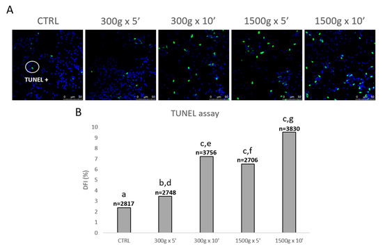 Representative photomicrographs of equine spermatozoa observed by Laser Scanning Confocal Microscopy (LSCM) after no centrifugation (CTRL) or centrifugation at 300× g for 5 min and 10 min and centrifugation at 1500× g for 5min and 10 min and Terminal Deoxynucleotidyl Transferase-mediated dUTP Nick-End Labeling (TUNEL) assay. Green and blue fluorescence were related to Alexa Fluor 488 and Hoechst 33258, respectively. Scale bars are reported (panel A). DNA fragmentation index (DFI) was determined as the percentage of green labelled cells (TUNEL positive) to the total cell number (Hoechst 33258). Numbers of analyzed spermatozoa for each group are indicated at the top (panel B). Chi-square test: a,b = p < 0.05; a,c = p < 0.0001; d,e = p < 0.0001; f,g = p < 0.0001.