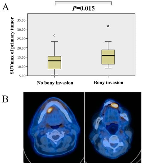 (A) Correlation between maximum standardized uptake value (SUVmax) of primary tumor and bone invasion. Oral squamous cell carcinoma (OSCC) with bone invasion showed a significantly higher SUVmax (Mann–Whitney U Test, p = 0.015). (B) Representative axial fused FDG-PET/CT images showing, on the left, a tumor with a low SUVmax (7.3). Histopathological analysis showed no bone invasion. On the right, the SUVmax was 21.8, and the tumor showed bone invasion.