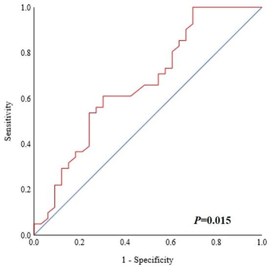 Receiver operating characteristic (ROC) curve showing the maximum standardized uptake value (SUVmax) and bone invasion. The best cutoff was determined to be 9.5. The area under the curve (AUC) was 66.5% (95% CI 53.9%–79.1%) (p = 0.015).