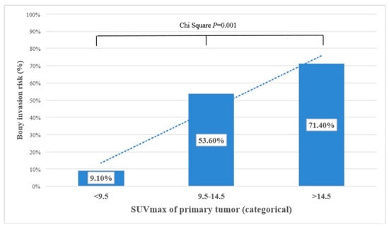 Categorical representation of maximum standardized uptake value (SUVmax) and bone invasion risk. Oral squamous cell carcinoma (OSCC) with low SUVmax had a very low risk for bone invasion, while the risk increased in an almost linear manner with increasing SUVmax (Pearson chi-squared test, p = 0.001).