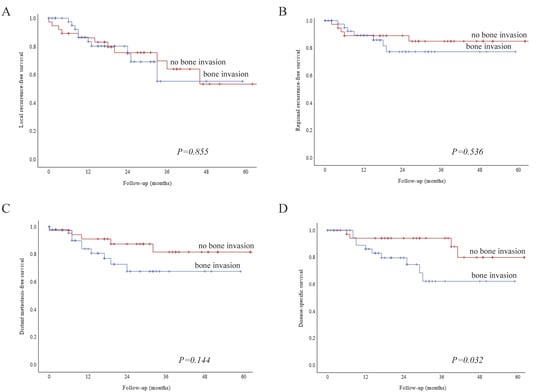 Kaplan–Meier analysis showing relative survival according to bone invasion. Local recurrence-free survival (A, log-rank, p = 0.855), regional recurrence-free survival (B, log-rank p = 0.536), and distant metastasis-free survival. (C, log-rank, p = 0.144) were similar for both groups. Disease-specific survival was worse in patients with bone invasion (D, log-rank, p = 0.032).