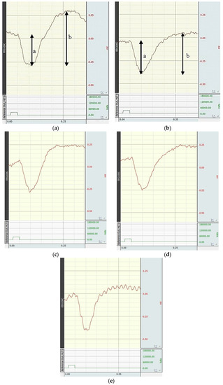 Examples of electroretinograms of Wistar rats in experimental groups are presented in Figure 4. When simulating retinal ischemia–reperfusion, the amplitude of the b-wave changed significantly, the suppression of which is shown in Figure 4b. When correcting the simulated pathology by the studied substance, nicotinic acid, and Emoxipine, an increase in the b-wave amplitude to varying degrees was observed (Figure 4c–e).