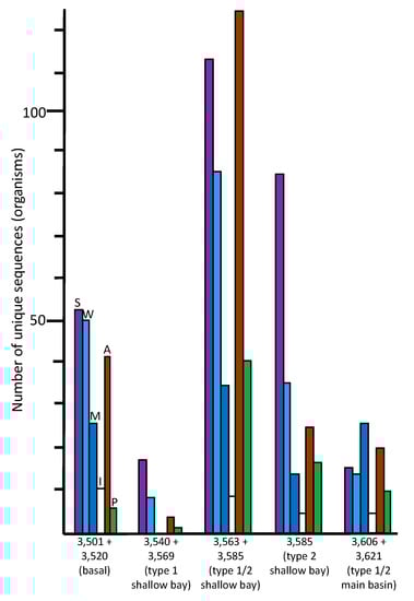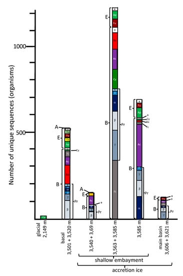 The peninsula that separates the embayment from the main basin is approximately 10 km from the western shore (Figure 1). The ice that accreted over the southern main basin to the east of the peninsula (the 3606 + 3621 m sample) has lower concentrations of sequences, including lower numbers of organisms and lower concentrations of ions [,,,,,] (Figure 2, Figure 3, Figure 4 and Figure 5). Reports further out in this region indicate that the levels of organisms and organic carbon continue at very low levels across the southern basin []. Therefore, the shallow embayment appears to be the area with the highest levels of biological activity, and relatively high sequence diversity (Shannon–Weaver index = 4.59, evenness = 0.44), possibly due to energy and chemical inputs from hydrothermal activity, as well as some chemical contributions from the basal ice. Conversely, the southern main basin appears to be extremely oligotrophic.