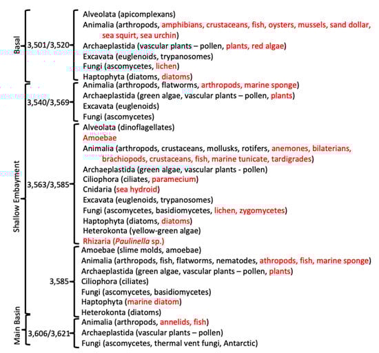 The accretion ice had more unique sequences from eukaryotic species than did the basal ice, which suggested a more complex ecosystem in the lake (Figure 6). This included a number of small animals (e.g., arthropods, flatworms, crustaceans, mollusks, rotifers, fish, and nematodes). Additionally, a number of animals are suggested, because of the bacteria and protists that are normally associated with them (e.g., annelids, fish, marine sponges, anemones, bilaterians, brachiopods, and tardigrades). Sequences from plants are likely from pollen that is delivered to the lake water by the glacier. Pollen has been reported from microscopic examination of the accretion ice meltwater (e.g., []). Sequences from green algae were detected throughout the shallow embayment, while they were absent from the basal ice sample, indicating that they might have originated in the shallow embayment. While they are not photosynthetically active, they may be able to survive heterotrophically, as do some algae and cyanobacteria. Ascomycetous fungi were found in all of the ice core sections, while basidiomycete sequences were found only in accretion ice from the middle and eastern portions of the shallow embayment, and one possible zygomycete species was found in the middle section of the shallow embayment. Many of the same ascomycete and basidiomycete species were isolated in our previous studies of the Vostok accretion ice (and glacial) cores [,]. There were a few species of amoebae and slime molds indicated in the accretion ice from the shallow embayment, as well as many species of protists, including ciliates, diatoms, dinoflagellates, yellow-green algae, euglenoids, trypanosomes, heterokonts, and rhizarians. Therefore, Lake Vostok may contain a functioning ecosystem that receives chemical and energy inputs from the overriding glacier and from possible hydrothermal sources.