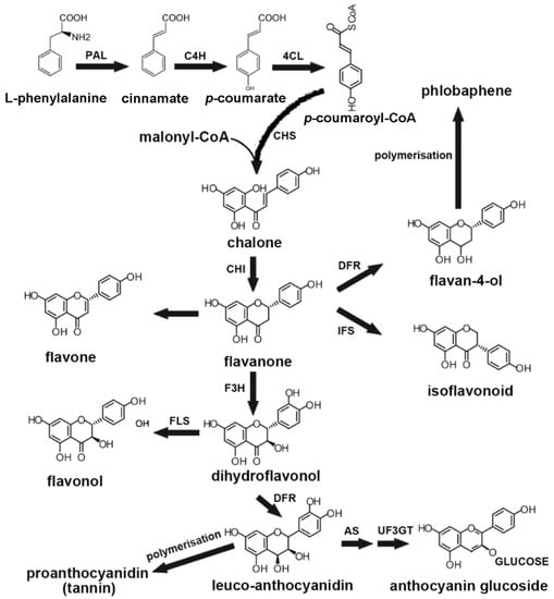 Simplified pathways involved in the biosynthesis of flavonoids in plants. The biosynthetic pathway is adapted from previous studies [88,89,97]. PAL, phenylalanine ammonia-lyase; C4H, cinnamate 4-hydroxylase; 4CL, 4-coumaric acid:coenzyme A ligase; CHI, chalcone flavanone isomerase; F3H, flavanone 3-hydroxylase; CHS, chalcone synthase, DFR, dihydroflavonol 4-reductase; AS, anthocyanin synthase; IFS, isoflavonoid synthase; FLS, flavonol synthase; UF3GT, UDP-glucose: flavonoid 3-0-glucosyl-transferase.