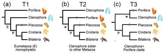 Topologies for the deepest branches in the metazoan tree recovered in phylogenomic analyses. (a) Porifera (sponges) sister to all other metazoa. This hypothesis includes a clade designated Eumetazoa (E). (b) Ctenophora (comb jellies) sister to all other metazoa. (c) A sponge+ctenophore clade sister to all other animals. All trees shown include a clade named Parahoxozoa (P) [43]. The Parahoxozoa topology was fixed based on King and Rokas [10], but an alternative topology with bilateria sister to a placozoa+cnidaria clade is also plausible.