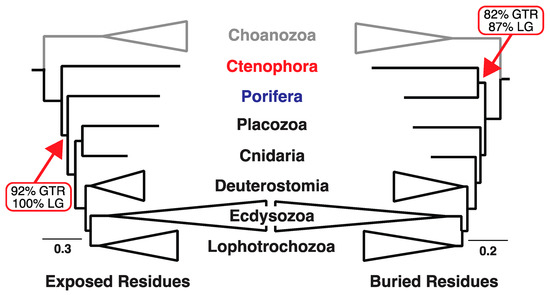 We did not explore the basis for the unusual signal associated with gene 41 any further. The most straightforward reason for the unusual signal is that gene 41 was an incorrect orthology call. Indeed, the goal of this outlier gene analysis was to identify any cases of hidden paralogy in the Ryan et al. [6] gene set. However, there are two alternatives to hidden paralogy that could explain the unusual signal. The first alternative is that the gene tree associated with gene 41 might differ from the species tree due to the multispecies coalescent [25,26,27], although it is unclear whether the branches at the base of the metazoan species tree are short enough for discordant gene trees to be common. The second alternative is that there could be some unknown source of bias associated with gene 41. Regardless, removing gene 41 did not have a substantive impact on the trees recovered after dividing sites into subsets based on relative solvent accessibility. Analysis of exposed sites from the 232-protein dataset using the LG+Γ model resulted in a tree with a topology identical to that recovered when exposed sites from the FRG dataset were analyzed (Figure 2). Specifically, we found 97% bootstrap support for T2 and 99% support for the placozoa+cnidaria clade. Buried sites from the 232-protein dataset yielded a tree with one rearrangement relative to the buried FRG tree when analyzed using the same method; the rearrangement was in the outgroup. The ingroup topology for the 232-protein buried tree was identical to that for the FRG dataset; bootstrap support for T3 was 87% and support for the cnidaria+bilateria clade was 55%. Both trees are available in Supplementary File S3.