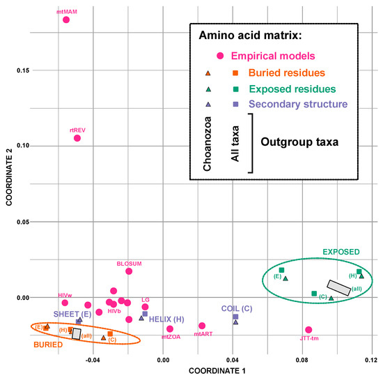 Multidimensional scaling plot showing the Euclidean distances between various amino acids exchange rate matrices. Different colors indicate different categories of the matrices in the online version (Green: exposed residues, Orange: buried residues, Purple: secondary structure, and Pink: standard empirical models).