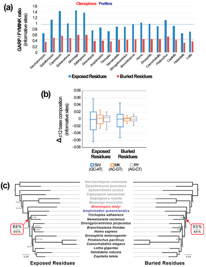 In this study, we examined whether different signals were associated with sites in different protein structural environments. Specifically, we subdivided globular proteins based on their structure and explored the distribution of signal supporting different placements of the root for the metazoan tree of life. Deep metazoan phylogeny has been a difficult phylogenetic problem, but there are a limited number of plausible arrangements for the major lineages (Figure 1). The traditional hypothesis (Figure 1a), which is supported by morphology [35] and some phylogenomic analyses [9,11,36,37,38], places sponges sister to all other metazoans. Many other analyses of large-scale datasets [7,39,40,41,42] support the hypothesis that ctenophores are sister to all other metazoans (Figure 1b). The third possibility, a sponge+ctenophore clade (Figure 1c), was recovered in analyses the Ryan et al. [6] genomic dataset (hereafter called the “RG dataset”) and some of the analyses in Borowiec et al. [42]. Support for the sponge+ctenophore clade in analyses of the RG dataset is limited, suggesting the RG dataset might be characterized by a mixture of conflicting signals. Our analyses revealed that the signal associated with solvent-exposed residues differed from the signal associated with buried residues; we believe that this has implications for the fit of models that are currently used for phylogenetic analyses of protein sequences.