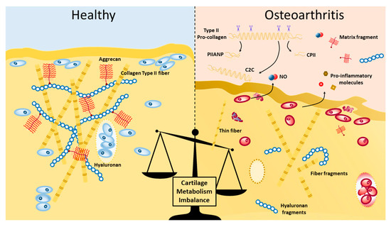 Under pro-inflammatory conditions, the catabolic events are not sufficiently counterbalanced by the anabolic events given the impaired synthesis of cartilage matrix molecules, e.g., collagen type II, V, and aggrecan [13]. This continuing imbalance leads ultimately to the failure to compensate matrix cartilage damage induced in the local synovial joint (Figure 1).