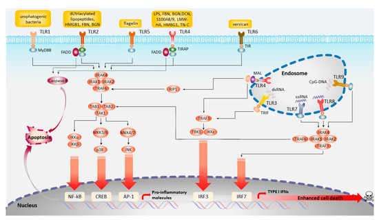 TLR signaling is dependent on five TIR domain-containing adaptors; however, only MyD88 and TRIF function as transducers [64]. TRAM and TIRAP are bridging adaptors, while SRAM regulates (negatively) TRIF. TLR activation via Myd88 (TLR2, TLR7, TLR8, and TLR9), TRIF (TLR3), or both (TLR4) can lead to apoptosis, demonstrating that Myd88 and TRIF can activate apoptosis independently and, perhaps, the cross-talk between the two signaling pathways (TLR4) can lead to apoptosis as well [65,66,67]. The Myd88-dependent pathway initiates the recruitment of MyD88 and TIRAP via the TIRTIR homophilic interaction as a result of TLR dimerization. Myd88 then forms a complex with IL-1R-associated kinases (IRAK4 and IRAK1) and TRAF6. TRAF6 activation is repercussioned in the TGF-β-activated kinase 1 (TAK1)–TAB1/2/3 complex leading to the activation of the canonical NF-kB pathway and the MAP kinases (Figure 2). Overexpression of Myd88 induces a low level of apoptosis [65]. However, TLR-MyD88 role in cell death is suggested to be mostly indirect, via the signaling induction of pro-apoptotic molecules such as TNF-α or NO [68,69].