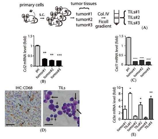 Isolation and characterization of tumor-infiltrating leukocytes (TILs) in the tumor microenvironment. (A) The schematic drawing for obtaining three independent prostate tumor tissues (tumor#1-#3) and their corresponding TILs (TILs #1-#3). Primary cells prepared from TRAMP-C1 cell line-derived tumors were subcutaneously (s.c.) injected into three C57BL/6 mice. The tumor tissues were treated with collagenase/DNase treatment (Col. IV) followed by Ficoll gradient to enrich TILs. (B,C) Validation of reduced inflammatory chemokines mRNA in tumor tissues (Ccl2, panel B) and (Cxcl1, panel C). mRNA levels of tumor tissues (P2-T, P3-T1, P3-T2, and P3-T3) were normalized to Gapdh for comparison with primary cells (pri.). (D) Left: selected images of macrophages in tumor tissues (arrows) by immunohistochemistry (IHC) using an antibody against CD68. Scale bar: 10 µm. Right: isolated TILs visualized with Hematoxylin and Eosin (H&E) staining. Large arrows: macrophage, small arrows: lymphocytes. Scale bar: 20 µm. (E) Enrichment of lymphocytes in the tumor tissues and TILs by monitoring mRNA levels of a lymphocyte marker Cd3e. (F,G) Monitoring subclasses (M1 and M2) of macrophage in the TILs by measuring an M1 marker Nos2 (panel F) and an M2 marker Arg1 genes (panel G). qPCR measurements were derived from three replicates and results are presented as the mean ± SD. Student’s t-test. * p < 0.05, ** p < 0.01, *** p < 0.001, **** p < 0.0001.