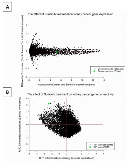 In line with the observation that the absolute mRNA expression level of a gene does not necessarily determine its importance in a given biological system, we have computationally predicted that the molecule PHAX is “rewired” in ccRCC patients treated with sunitinib compared to untreated patients with a comparable disease profile. Despite a considerable change in apparent network connectivity following sunitinib treatment, the PHAX mRNA is not differentially expressed in response to the treatment. The rewiring we observe implies some combination of altered protein abundance, post-translational modification (such as phosphorylation), or protein behaviour (such as change in cellular localisation) has occurred in PHAX following sunitinib treatment.