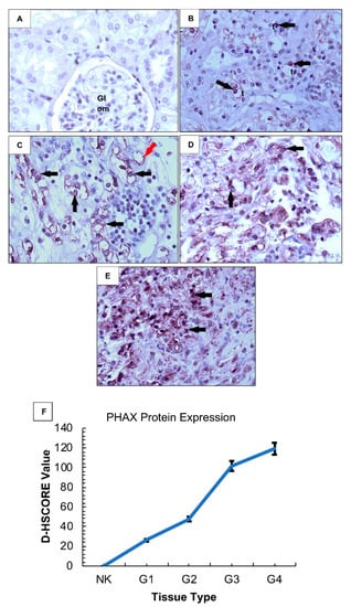 PHAX protein expression in clear cell renal cell carcinoma (ccRCC) grades 1–4 and adjacent normal kidney (NK) cells. (A) NK cells show a negligible level of PHAX expression, with a mild signal detected in some tubular epithelial cells (t) in ccRCC grade 1 (B), increasing in intensity and frequency in high grade tumours (G2–G4) within the intertitial capillary network (red arrow) and in sheets of tumour cells (arrows), both cytoplasmic and nuclear patternx (C–E). Signal intensity is presented as a digital histological score (D-HSCORE) with high grade tumours showing statistically significantly increased expression for PHAX (F). (NK vs. G1—(*p < 0.05), NK vs. G2—(** p < 0.01), NK vs. G3 or G4—(*** p < 0.0001), G1 vs. G2—(* p < 0.05), G1 vs. G3/G4—(** p < 0.01), G2 vs. G3—(**p < 0.01), G3 vs. G4—(ns)). Bars = means + SEMs. N = 3 per group with similar results. Original magnification ×250.