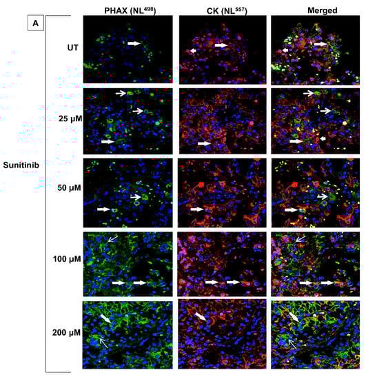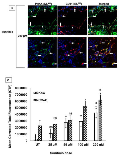 Sections of ccRCC and NK organ cultures from UT controls and those sunitinib-treated ones (25, 50, 100, and 200 µM) were subjected to combined-immunostaining for PHAX (1:100 dilution) and cytokeratin (CK; epithelial marker) or CD31 (endothelial marker) (1:500 dilution). Antibody binding sites were visualised using secondary antibody-conjugated to Northern Light-498 or Northern Light-557 (R&D Systems, Oxford, UK) (1:100 dilution) and incubated 1 h at room temperature. Hoechst-33342 (1 μg/mL) was used for nuclei detection. Species-specific antisera were used as negative controls. Slides were dehydrated in ascending series of ethanol, cleared in xylene, and mounted in DePeX mounts (Sigma-Aldrich, 8 Homefield Rd, Haverhill CB9 8QP, UK). Slides were viewed on a Leica TCS-SPE confocal microscope (CLSM) (Leica Microsystems, Milton Keynes, UK), and the image for each fluorophore was acquired sequentially using the same constant acquisition time and settings rather than simultaneously to avoid crosstalk between channels. Images were then processed in Adobe Photoshop CS6 software. The following formula was used to calculate the mean corrected total fluorescence in organ cultures: (CTF) = (integrated density)—(area of selected cell × mean fluorescent of background readings). Fluorescence intensity was measured using image J version 1.4v, and data were transferred to Microsoft Excel and GraphPad Prism v7.0d (LaJolla, CA, USA) for calculations of means ± SEMs.