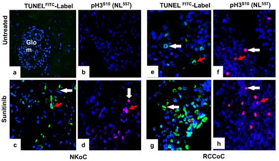 Representative confocal images of TUNEL and pH3S10 immunostaining on sections of ccRCC and NK organ cultures either untreated or treated with 200µM sunitinib for 1 h at 37 °C. Untreated (UT) controls of NK (panels a,b) and ccRCC (e,f) organ cultures showed negligible signals for TUNEL or pH3S10. In contrast, sunitinib treatment resulted in an increased signal for TUNEL signal in NK organ cultures (c), more pronounced in ccRCC (g). In comparison, sunitinib treatment induced a minimal signal for pH3S10 in both organ cultures (d,h). Tumour cells (white arrows), vascular endothelial cells (red arrows). N = 3 per group with similar results. Original magnification ×40.