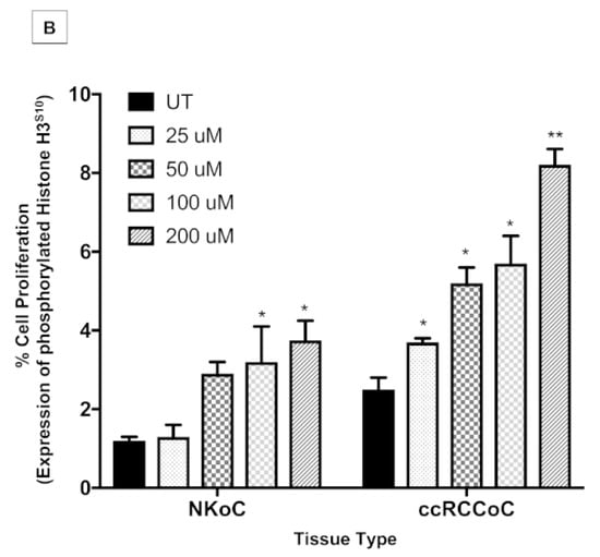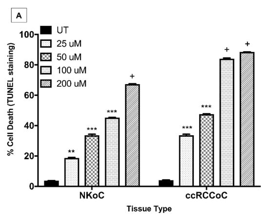 Effects of different doses of sunitinib on cell death (detected by TUNEL) and cell proliferation (detected by anti-phosphorylated histone H3S10 immunostaining) in organ cultures of human normal kidney and ccRCC organ cultures. N = 3 with similar results. Statistical significance compared to untreated controls (UT) is indicated as; *p < 0.05, **p < 0.01, ***p < 0.001, +p < 0.0001. NK—**p < 0.01—UT vs. 25 µM; ***p < 0.01—UT vs. 50 or 100 µM; +p < 0.0001—UT vs. 200 µM. ccRCC—**p < 0.001—UT vs. 25 µM or 50 µM; +p < 0.0001—UT vs. 100 µM or 200 µM. In contrast, sunitinib induced minimal cell proliferation, significantly only at a high dose as compared to UT controls (NKoC-p < 0.05 (UT vs. 100 or 200 µM); RCCoC-+p < 0.05 (UT vs. 50 or 100 µM and **p < 0.01-UT vs. 200 µM)).