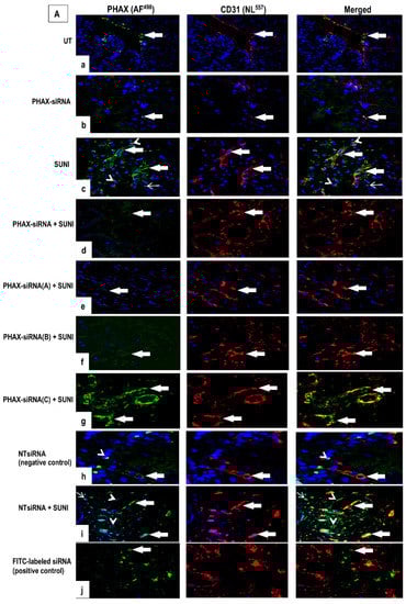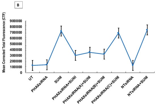 We next used siRNA to knockdown PHAX to determine its role in mediating sunitinib’s effect on grade 2 ccRCC in organ cultures. Successful siRNA-induced knockdown of PHAX protein was confirmed by immunofluorescence, co-immunostained with CD31 (Figure 6A). Cultures were either left UT or transfected with a cocktail of PHAX siRNA (containing a mixture of three siRNAs targeting human PHAX) or with each individual PHAX siRNA (PHAXs iRNA-A, B, and C) or a scrambled negative control siRNA (NTsiRNA) for 72 h before treatment with 200 µM sunitinib for 1 h at 37 °C. All cultures were then subjected to PHAX immunostaining. As compared to control groups (UT and NTsiRNA) which showed negligible levels of PHAX expression in CD31positive ECs, in some blood vessels, (Figure 6A,a), a strong signal was seen in cultures treated with sunitinib alone mainly localised to tumour cells, CD31positive ECs, and in some infiltrating mononuclear cells (Figure 5A,e). Notably, sunitinib-induced PHAX expression was markedly reduced in cultures pre-treated with a cocktail of PHAXs iRNA (Figure 6d) and with individual siRNA dup--A or B) (Figure 6A,e,f) but not C (Figure 6A,g). Control group (NTsiRNA) treated cultures alone showed minimal expression of PHAX expression similar to UT cultures (Figure 6A,h), while NTsiRNA in combination with sunitinib (Figure 6A,i) demonstrated a similar pattern to cultures treated with sunitinib alone (Figure 6A,c). Positive controls (transfected with FITC-conjugated siRNA) showed a strong signal in some infiltrating cells (Figure 6A,j). Quantification of the mean signal intensity in ccRCC organ cultures transfected with PHAX siRNA vs. UT is presented as corrected total fluorescence (CTF) intensity in Figure 6B.